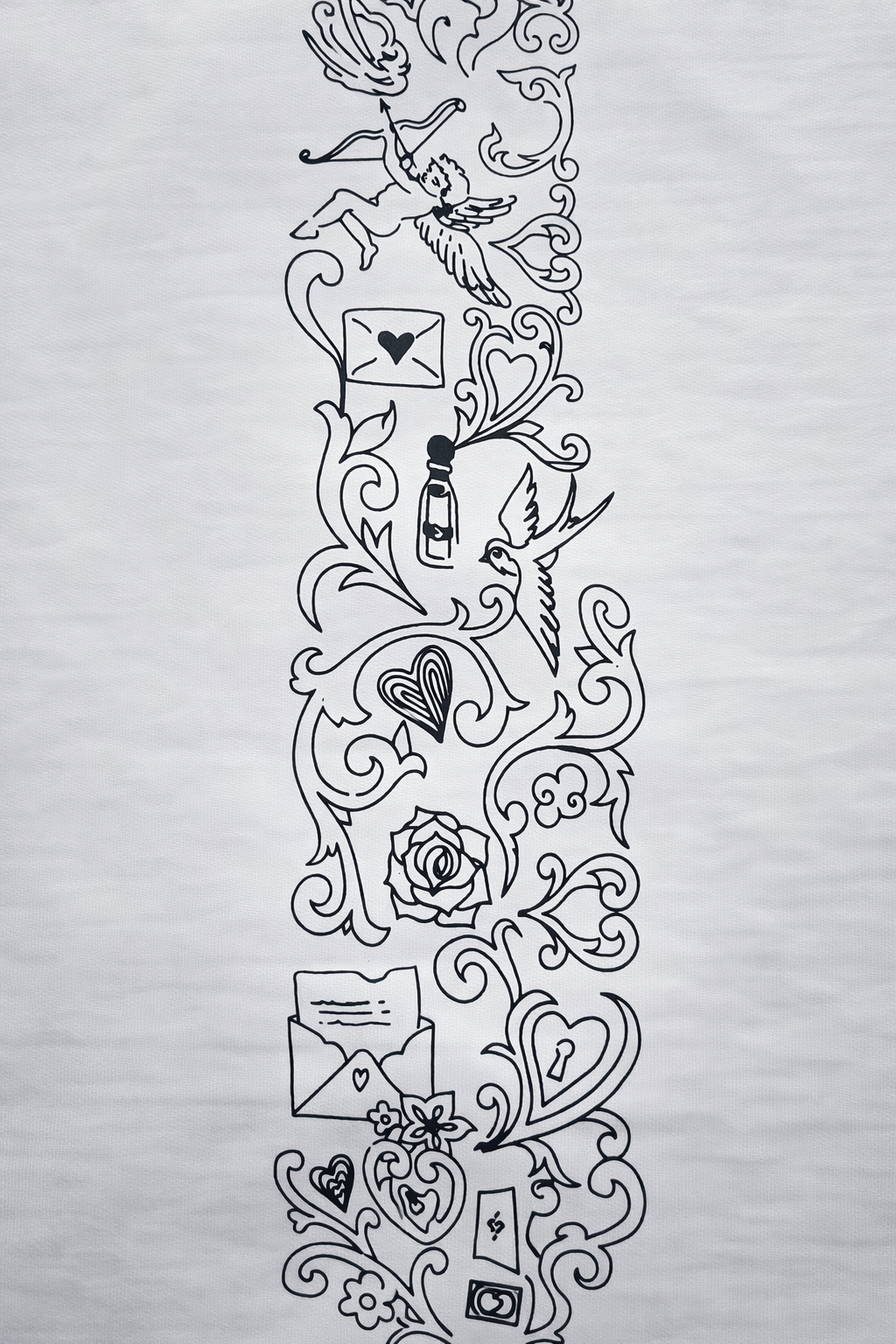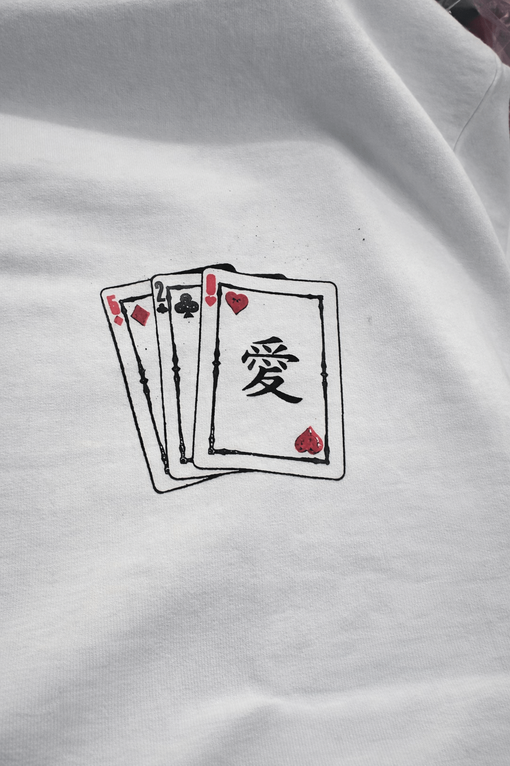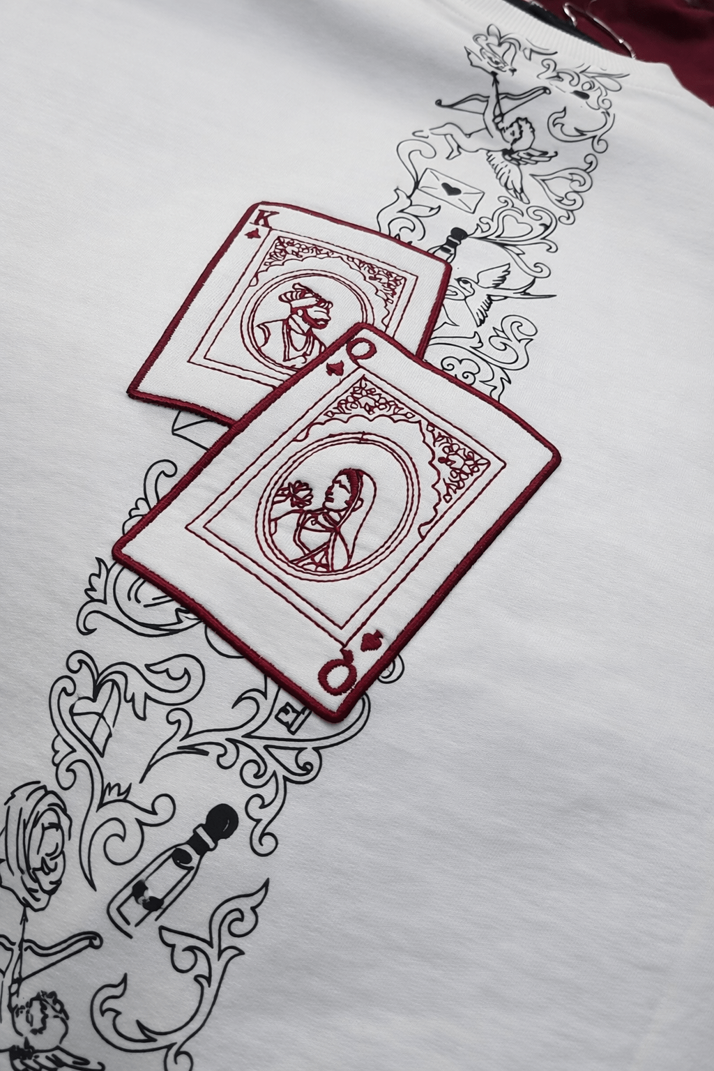 Meanwhile, the back design tells the full story. A vertical illustration of playing cards, roses, and hearts captures passion and uncertainty. Each symbol highlights the stakes involved in love. Therefore, the design connects deeply with those who value meaning in fashion.